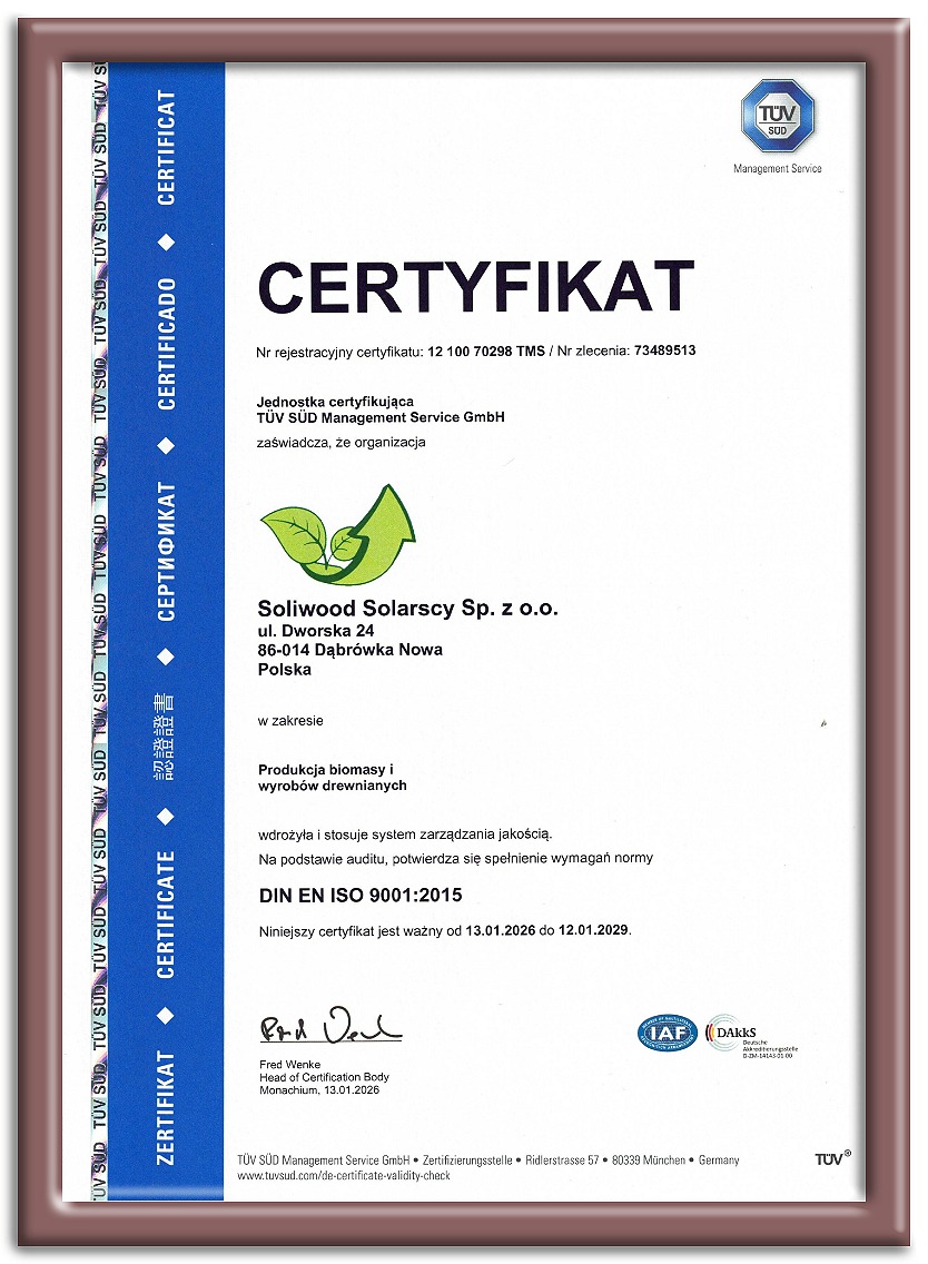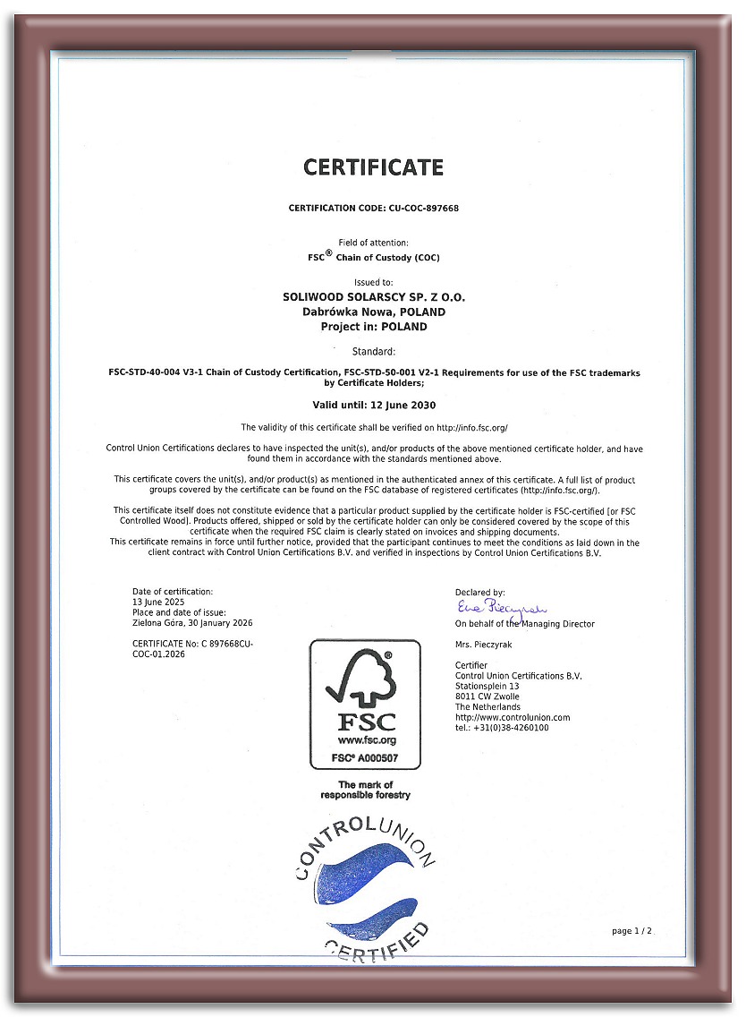 Certyfikaty W Soliwood Solarscy Sp. z o.o. stale podnosimy nasze kwalifikacje i dbamy o zgodność z najwyższymi normami, co potwierdzają uzyskane przez nas certyfikaty.
